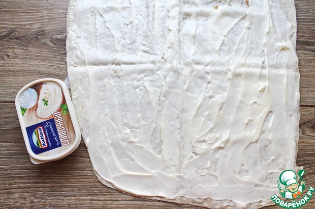 Лаваш расстелите и полностью смажьте плавленым сыром тонким слоем.