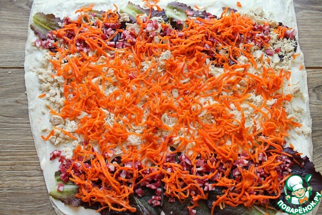 P.S Если не любите, чтобы из рулета, что то сыпалось, смешайте сыр, курицу, колбасу и намажьте лаваш, затем добавьте листья салата и морковь, прижав.