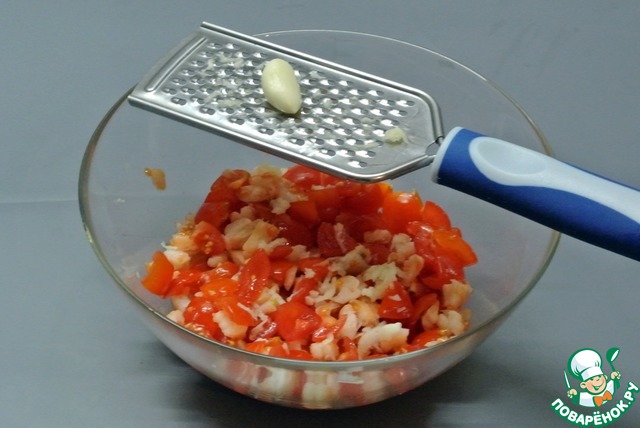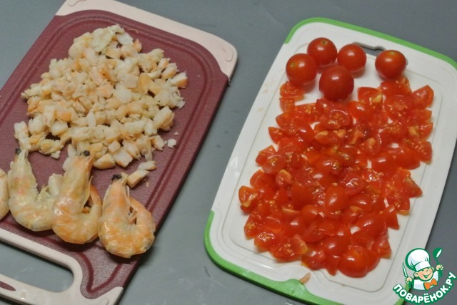 Креветки отварить в кипящей подсоленной воде. Остудить, очистить, мелко нарезать. Помидоры нарезать иелкими кубиками.