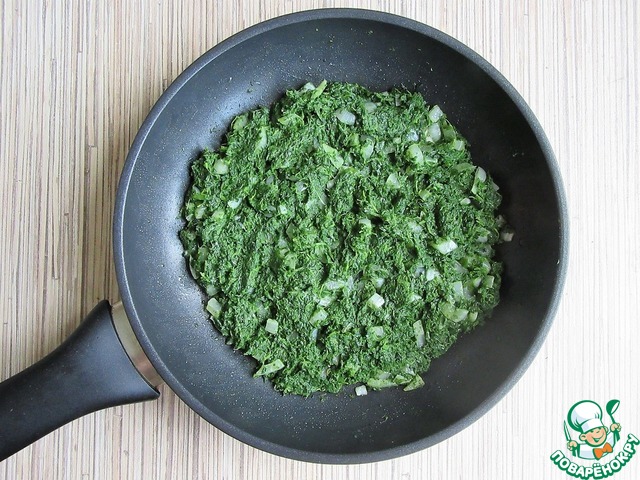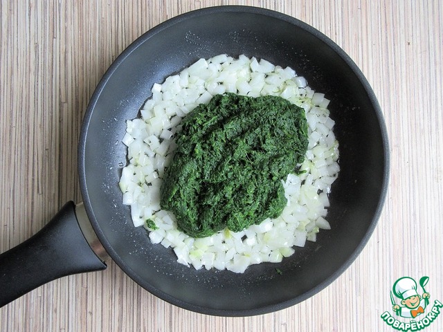 Лук мелко нарезать, обжарить на смеси рисового и сливочного масел, добавить шпинат (у меня замороженный).