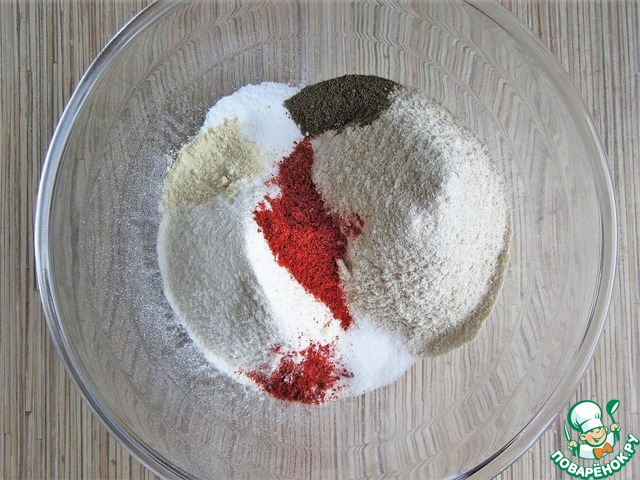 Смешать оба вида муки с разрыхлителем, паприкой, аджикой, черным перцем, чесночным порошком и солью.