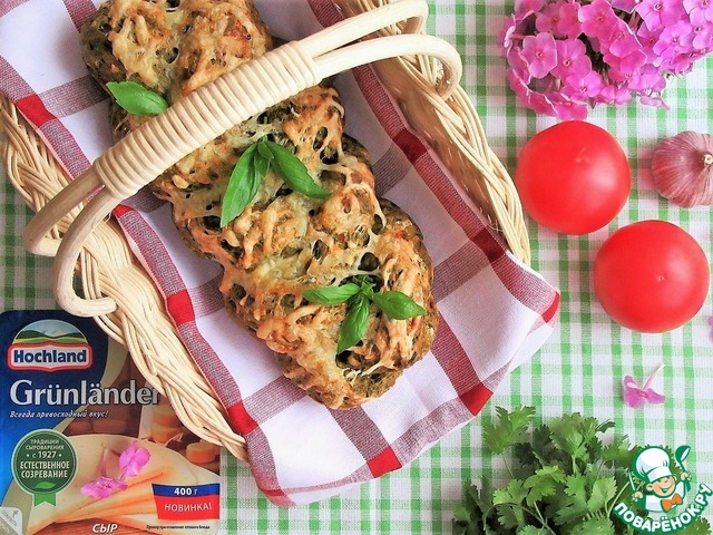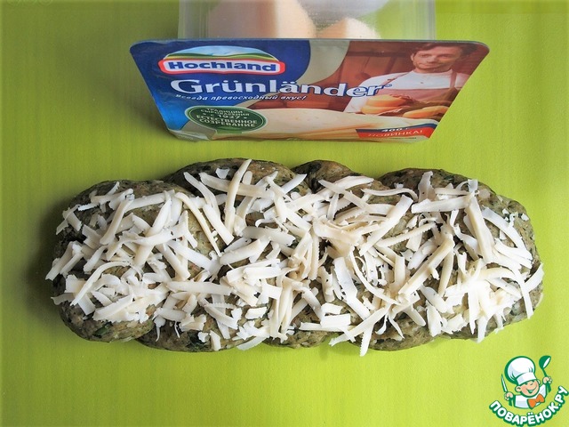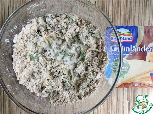 Добавить остывший шпинат с луком, рубленную кинзу, базилик и тертый сыр (у меня полутвердый, ТМ Hochland). Немного сыра оставить для посыпки.