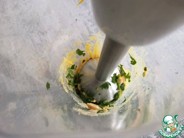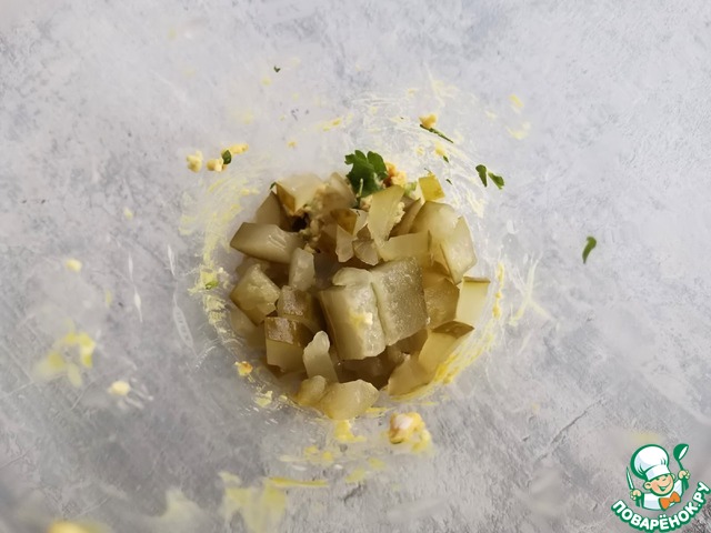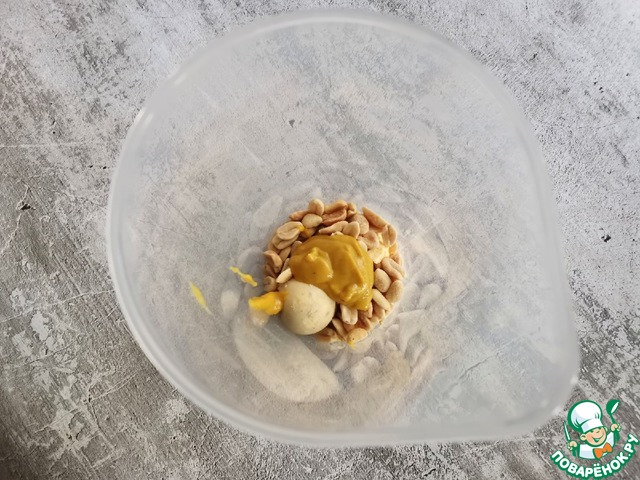 Желтки, горчицу, рассол от огурцов и арахис взбить в однородную массу. -