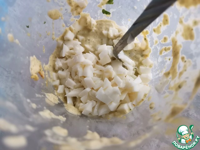 Яичный белок нарезать мелкими кубиками и аккуратно вмешать в соус.