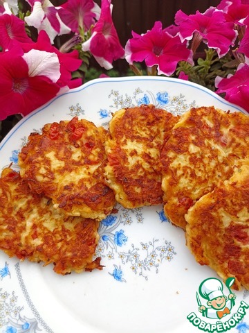 Добавляем в тесто тёртый сыр, муку. Перемешиваем. Тесто должно быть, как на оладьи.