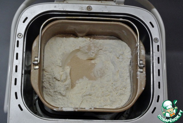 В хлебопечку выложить продукты в такой последовательности: вода, растительное масло, соль, сахар. Всыпать просеянную мку и сухие дрожжи.