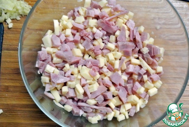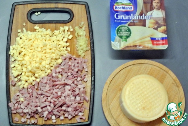 Для начинки ветчину и сыр мелко нарезать. Зубчики чеснока пропустить через пресс.