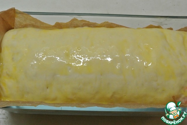 В форму выложить бумагу для выпечки. Выложить рулетик