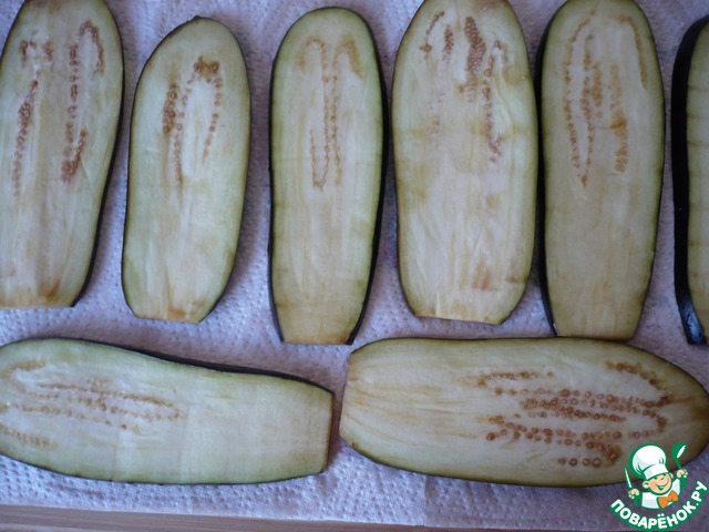 Баклажаны постояли 15 минут и теперь нужно их промыть от соли. Залить баклажаны чистой водой, а затем её слить. Ломтики баклажан разложить на бумажное полотенце, чтобы удалить лишнюю влагу.