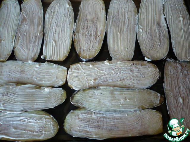Смазать каждый ломтик баклажана приготовленным соусом.