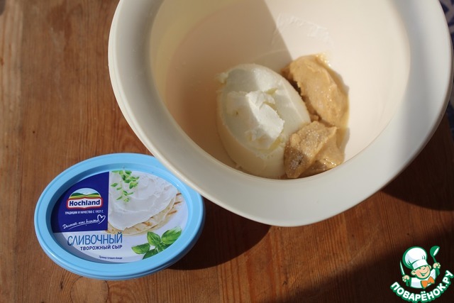 • Выложить в чашу сливочный сыр, арахисовую пасту, я добавила щепотку сахзама для уравновешивания вкуса.