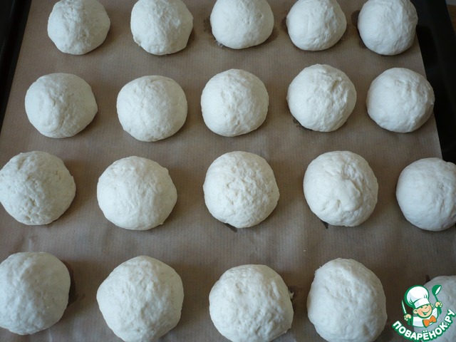 Смажьте руки растительным маслом и сформируйте из приготовленного теста небольшие булочки (шарики) ~ по 50 гр. каждая. Выложите булочки на противень застеленный пергаментной бумагой.