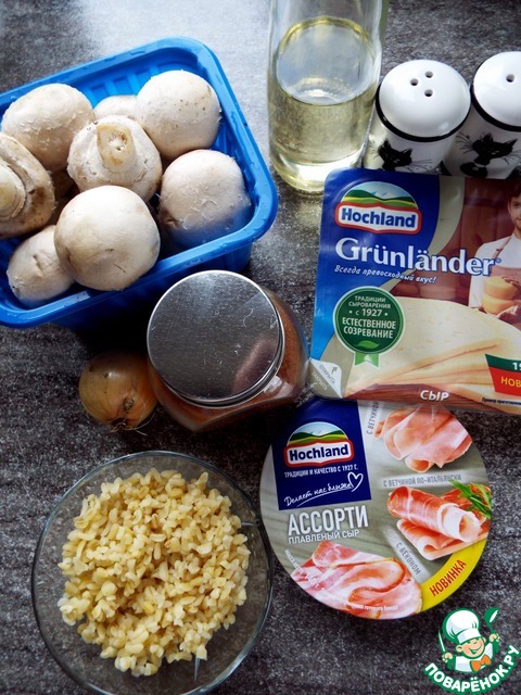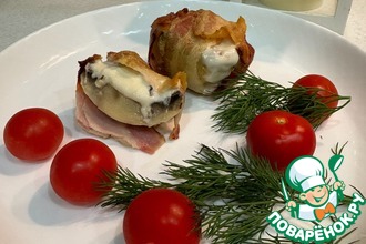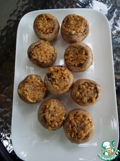 Удобнее всего немного примят сыр в некий шарик и уложить на гриб. -