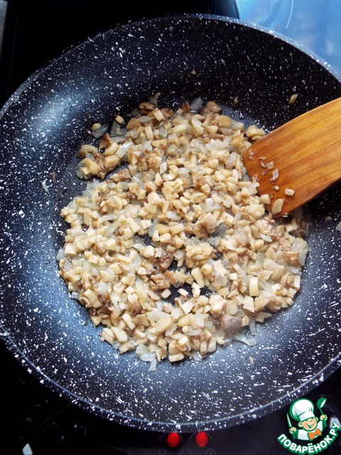 На масле обжарить лук (до мягкости). Добавить грибы и жарить пару минут.