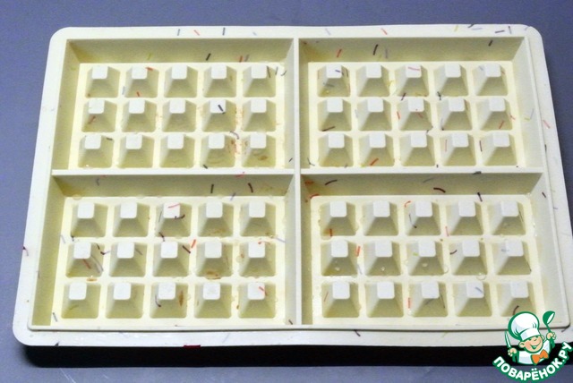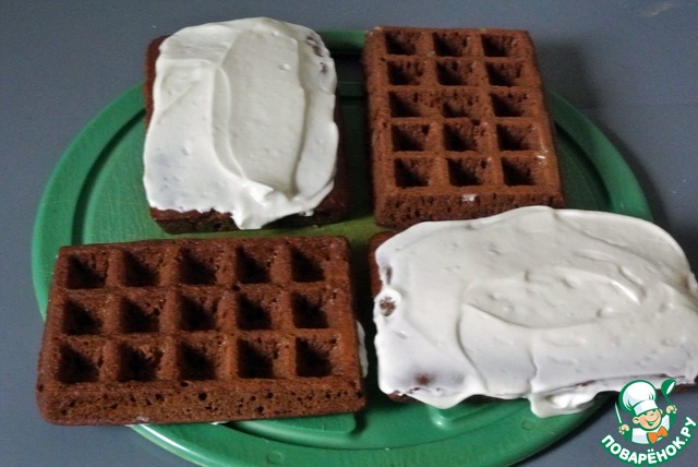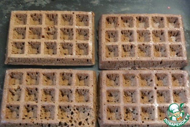 Налить по 3 столовые ложки теста в каждую вафлю.
