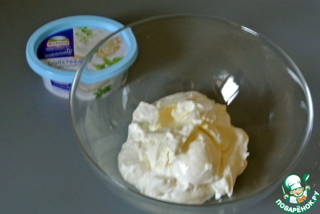 Для начинки выложить мягкий творог и творожный сыр. Всыпать заменитель сахар.