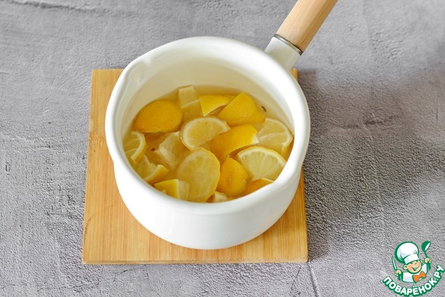 Залейте водой (50 мл), доведите до кипения, убавьте огонь до маленького и варите под крышкой до мягкости около 15-20 минут. Даже подсохший лимон распарится за это время. Проткните шкурку ножом. Она должна быть мягкой. Если нет - поварите еще немного. Вода должна за это время вся выкипеть. -