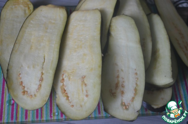 Баклажаны вымыть, нарезать вдоль пластинами, толщиной около 0.5 см, посолить и оставить по 30 мин. Затем промыть холодной водой и обсушить.