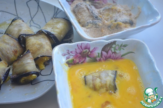 Вбить яйца. Обмануть рулетики сначала во взбитые яйца, затем в панировочные сухари и обжарить в растительном масле до золотистого цвета.