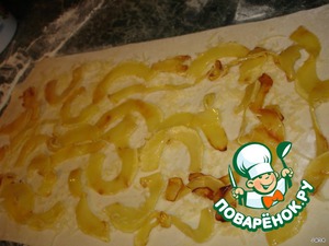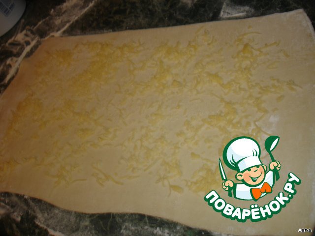 Пласт слоеного теста тонко раскатать прямоугольником. Посыпать сыром.