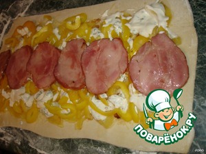 Рулетик из слоеного теста с обжаренными кусочками ветчины, кабачком и перцем.
