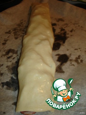 Аккуратно свернуть рулетом. Уложить на смазанный противень или пропитанную маслом пергаментную бумагу. Запекать в духовке 30 минут при температуре 200-230С.