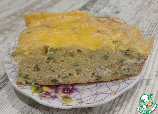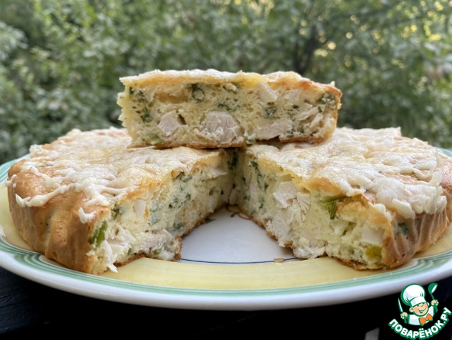 Сытный пирог с нежным куриным филе, ароматным зеленым луком и пикантной сырной корочкой сверху. Кусочек такого пирога составит прекрасную компанию чашке чая, а также послужит в качестве перекуса на свежем воздухе или на работе.