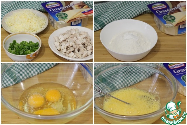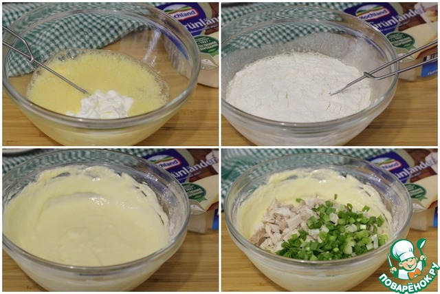 Яйца взбить миксером, добавить соль, сметану, муку, разрыхлитель и соду. К взбитой смеси подмешать зеленый лук и куриную грудку.