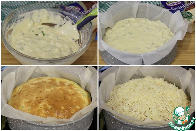 Выпекать в разогретой до 180° духовке, пока не начнет зарумяниваться. Достать из духовки и посыпать тёртым сыром. Поставить опять в духовку и выпекать, пока сыр не зарумянится.