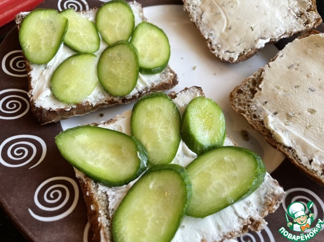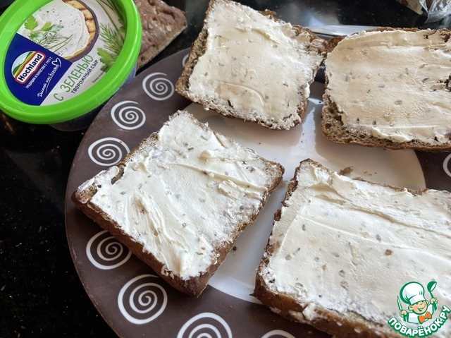 Булочки для сэндвичей смажьте творожным сыром с зеленью.