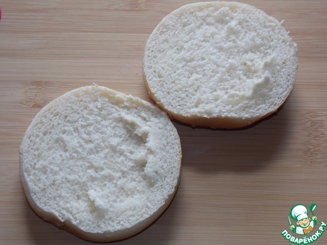 • Булочку (у меня не сладкая булочка с кунжутом) разрезать пополам.
