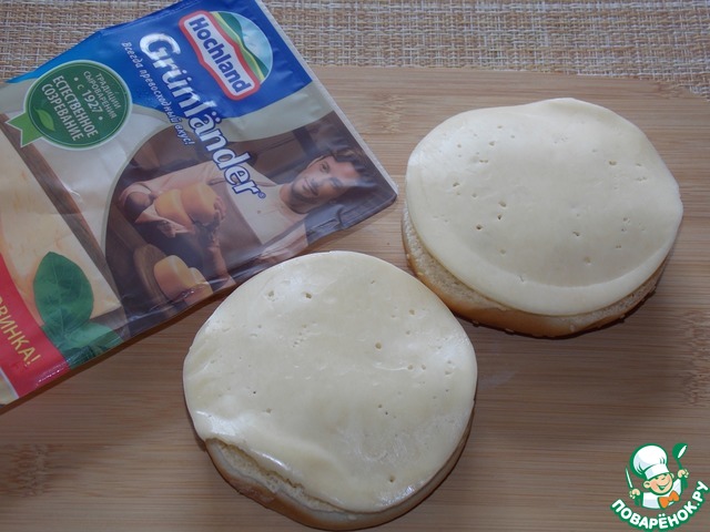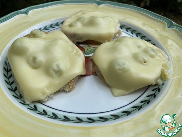 • Сверху положить по ломтику сыра (я использовала полутвердый сыр в нарезке). Поставить полученные бутерброды в микроволновку на полную мощность на 1-1,5 минуты, чтобы сыр немного расплавился.