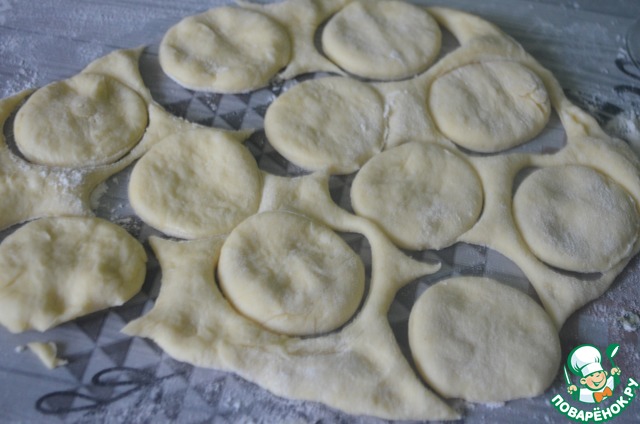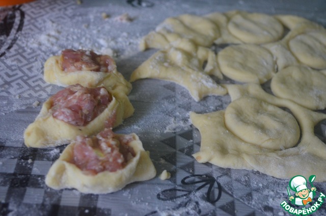 На каждый кружочек положите по 1 ст. л фарша и сформируйте заготовки-лодочки