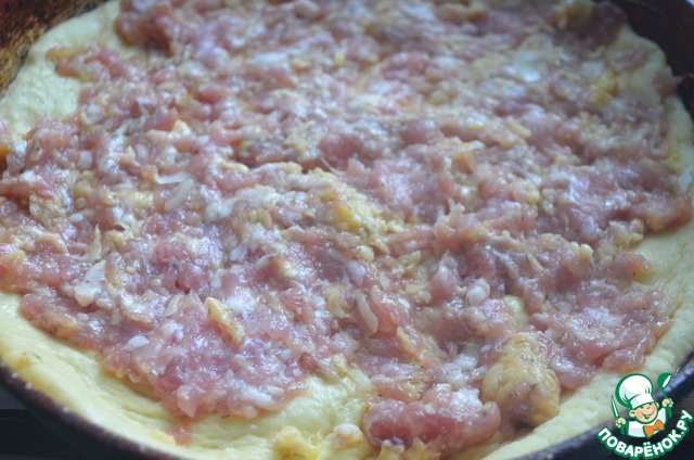 На дно формы, смазанной маслом, выложите пласт теста, на него фарш