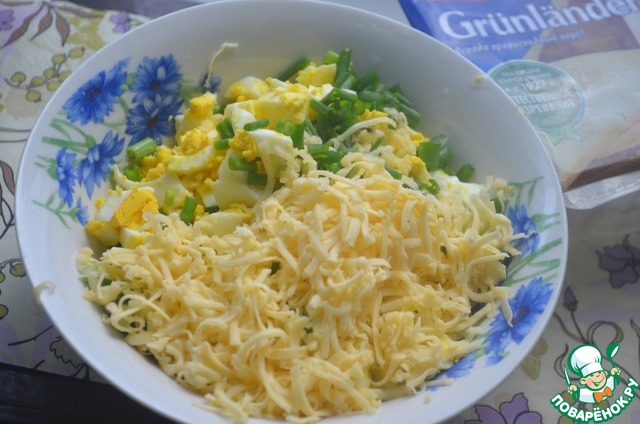Сварите 4 яйца вкрутую, очистите и нарежьте. Сыр натрите на мелкой терке, зелёный лук измельчите и смешайте с яйцами.