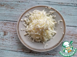 Яйца отварить, остудить, разделить на белки и желтки. Белки натереть на крупной тёрке.