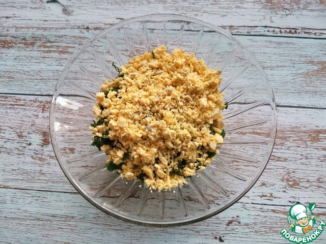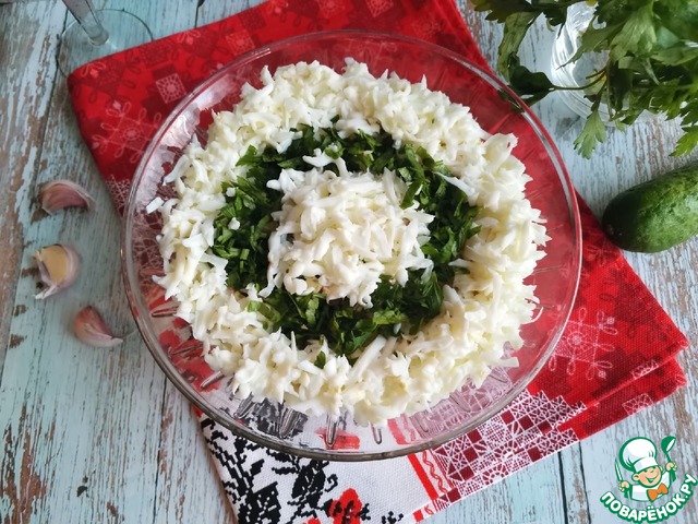 Украсить салат натёртыми белками и мелко порубленной петрушкой по своему вкусу.