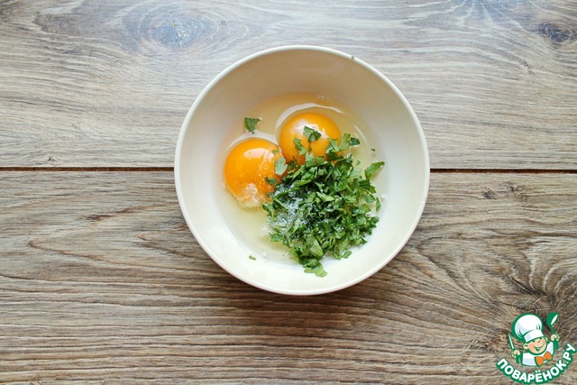 В миску разбейте яйца, посолите и добавьте мелко рубленую петрушку, перемешайте.