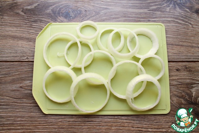 Репчатый лук, лучше всего брать плоский и широкий, очистите и порежьте на кольца. Разделите кольца на части и оставьте самые большие или средние, как вам нравится. Остальной лук можно использовать в других блюдах.