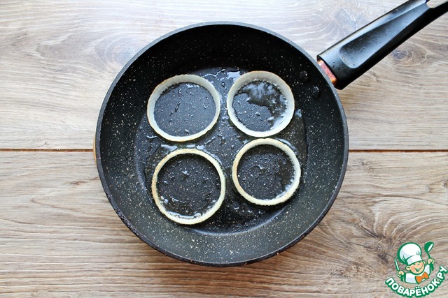 На сковороду налейте растительное масло и положите луковые кольца в один слой. Обжарьте их с одной стороны, переверните.