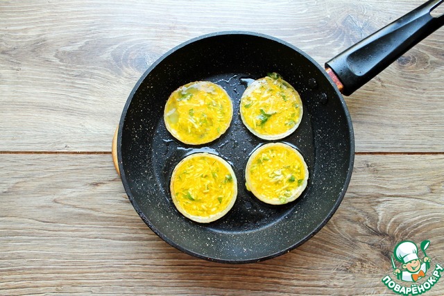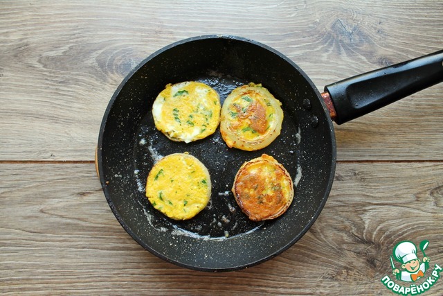 Залейте внутрь луковых колец омлет. Не старайтесь залить много, при обжаривании он поднимется и может убежать.