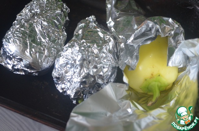 Перец вымыть, обсушить, завернуть каждый в фольгу и запечь в нагретой духовке до 180с до мягкости, примерно 15 мин