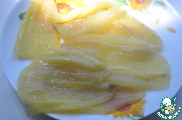 Остудить перцы, снять кожицу, удалить семена и плодоножки, затем разрезать перцы на 4 части.