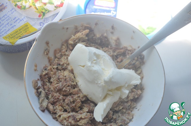 Чеснок мелко нарезать или пропустить через пресс, тунца достать из банки, размять вилкой, добавить творожный сыр. Размешать до однородной массы