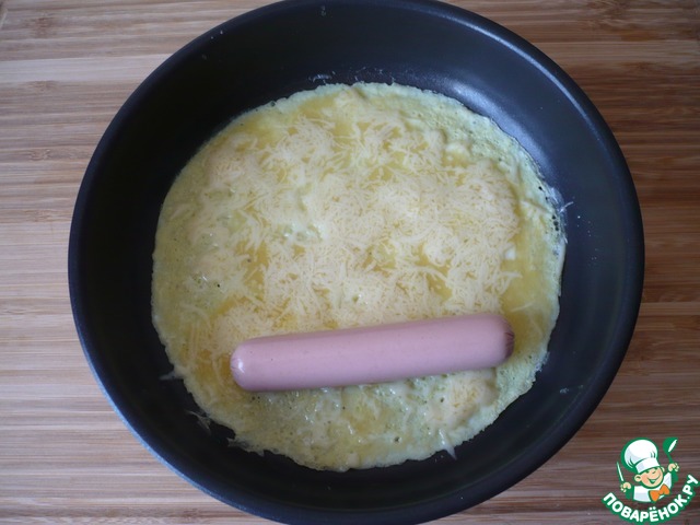 Аккуратно завернуть сосиску в омлет. Придвинуть яичный рулет к краю сковороды и на освободившееся место вылить еще ~ 1/3 яичной смеси и посыпать частью натертого сыра.