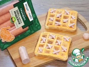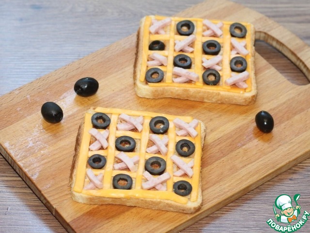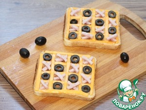 6. Из полосок сосисок, сделайте крестики, а из нарезанных кружочками маслин – нолики. Слегка поджарьте тосты в ростере или духовке и подавайте на завтрак.