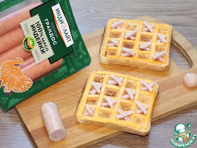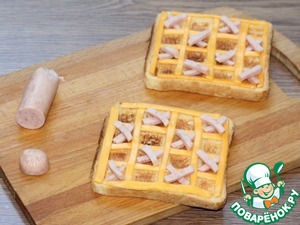 4. Порежьте тостовый плавленный сыр, большими полосками и маленькими полосками сосиски.