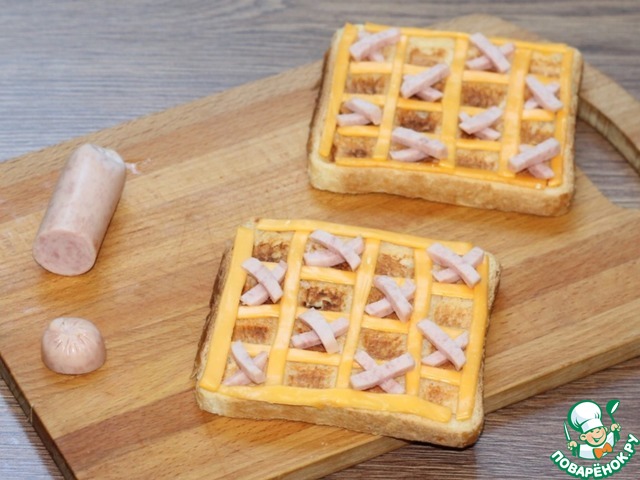 5. Смажьте тосты яичным белком. Сверху положите полоски сыра - это «клеточки», как для игры в «крестики-нолики».