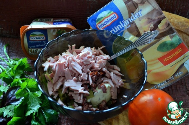 Колбасные изделия и огурец нарезать мелкими брусками, добавить к 120 г. плавленого сыра. Я использую плавленый сыр с грибами от ТМ "Hochland".