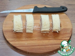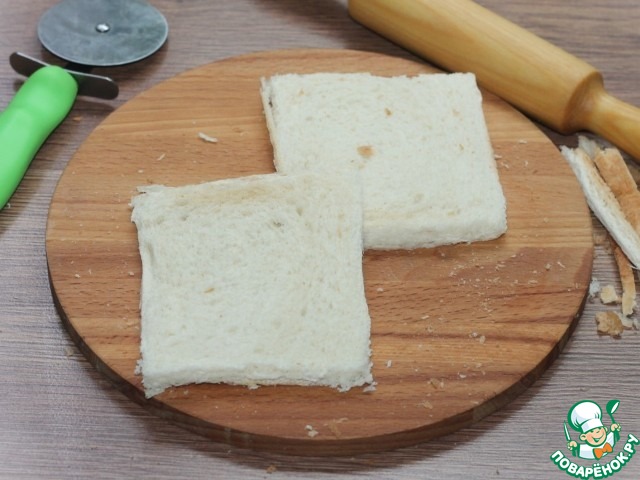5. С помощью скалки разровняйте 2 ломтика хлеба.
